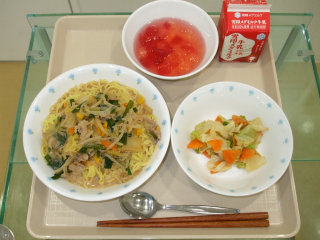味噌バターラーメン・中華風ピリ辛サラダ・あじさいゼリー・牛乳