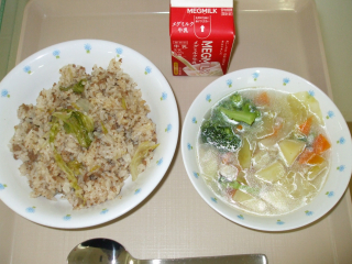牛ひき肉とレタスのチャーハン・野菜スープ
