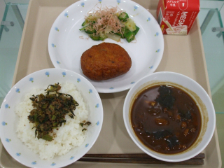ご飯・手作りさつま揚げ・野菜の梅おかか和え・赤だし味噌汁・エコふりかけ