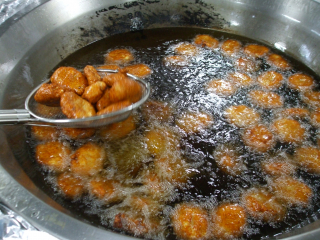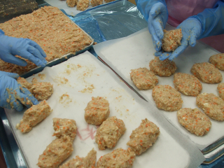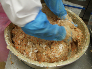 ▼さつま揚げは、タラやトビウオ、豆腐、人参、ごぼうなどを混ぜ合わせて作りました。トビウオは「アゴ」とも呼ばれ、旨味が強い魚です。