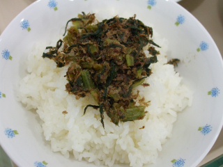 ▼本日は環境強化週間の最終日でした。環境に配慮し、味噌汁のだし取るために使用したかつお節を再利用して、ふりかけを作りました。