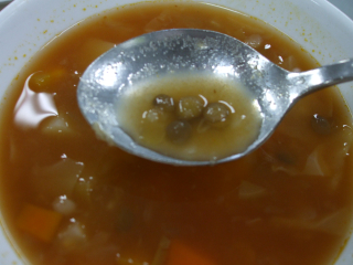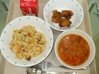本日は、1年生が社会科で学習している「アジア」に関連した料理でした。世界三大料理は、フランス料理・中華料理・トルコ料理です。トルコは、ヨーロッパとアジアの文化が融合し、多彩な素材、味、調理法を用いるのが特徴です。日本でも馴染みのある料理は、ピラフやケバブなどです。チョルバスとは、トルコ語で「スープ」を意味します。日本の味噌汁のようにさまざまな種類がありますが、本日はトルコで人気のあるレンズ豆を使用したトマトベースのチョルバスを食べました。