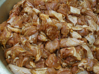 ▼鶏肉をにんにくやクミン、チリパウダーなどで漬け込み、皮目を上にして並べて焼き上げました。