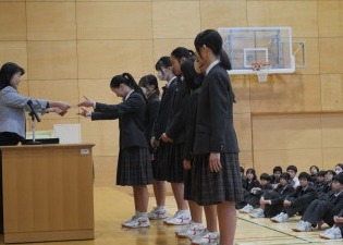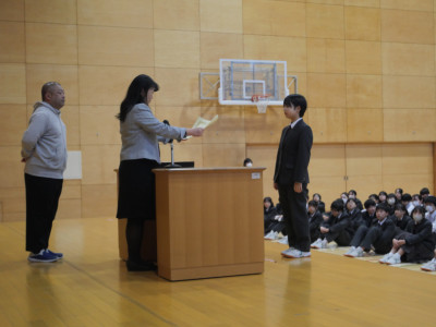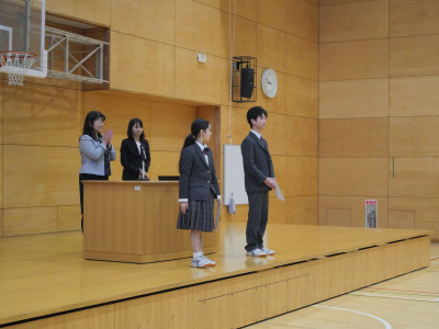 今日は表彰もたくさんありました。まずバドミントン部の表彰です。団体とダブルスで表彰されました。
